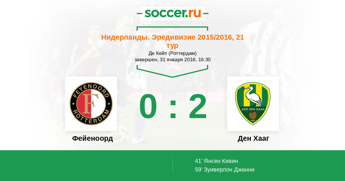 Нидерланды. Эредивизи 01.02.2015 Фейеноорд Логотип футбольный клуб Фейеноорд (Роттердам) 2:1 Логотип футбольный клуб Ден Хааг (Гаага) Ден Хааг