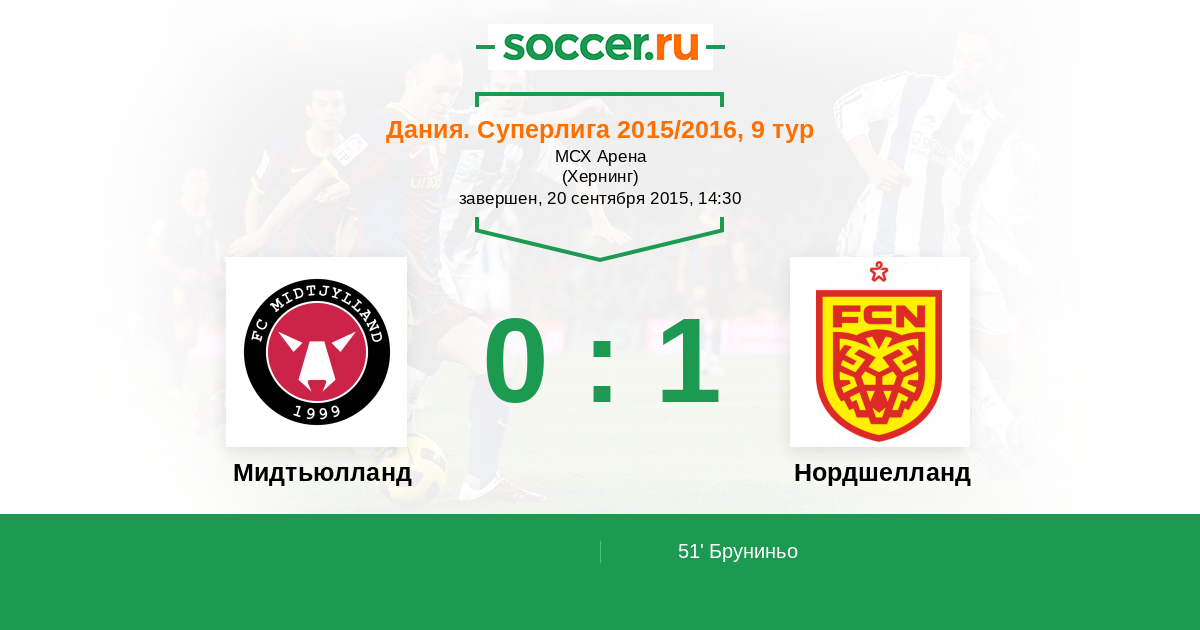 Дания. Суперлига 21.09.2014 Нордшелланд Логотип футбольный клуб Нордшелланд (Фарум) 2:1 Логотип футбольный клуб Мидтьюлланд (Хернинг) Мидтьюлланд