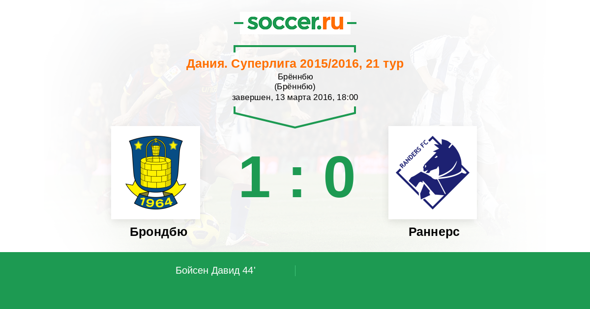 Дания. Суперлига 02.11.2014 Брондбю Логотип футбольный клуб Брондбю (Брённбю) 1:0 Логотип футбольный клуб Раннерс Раннерс