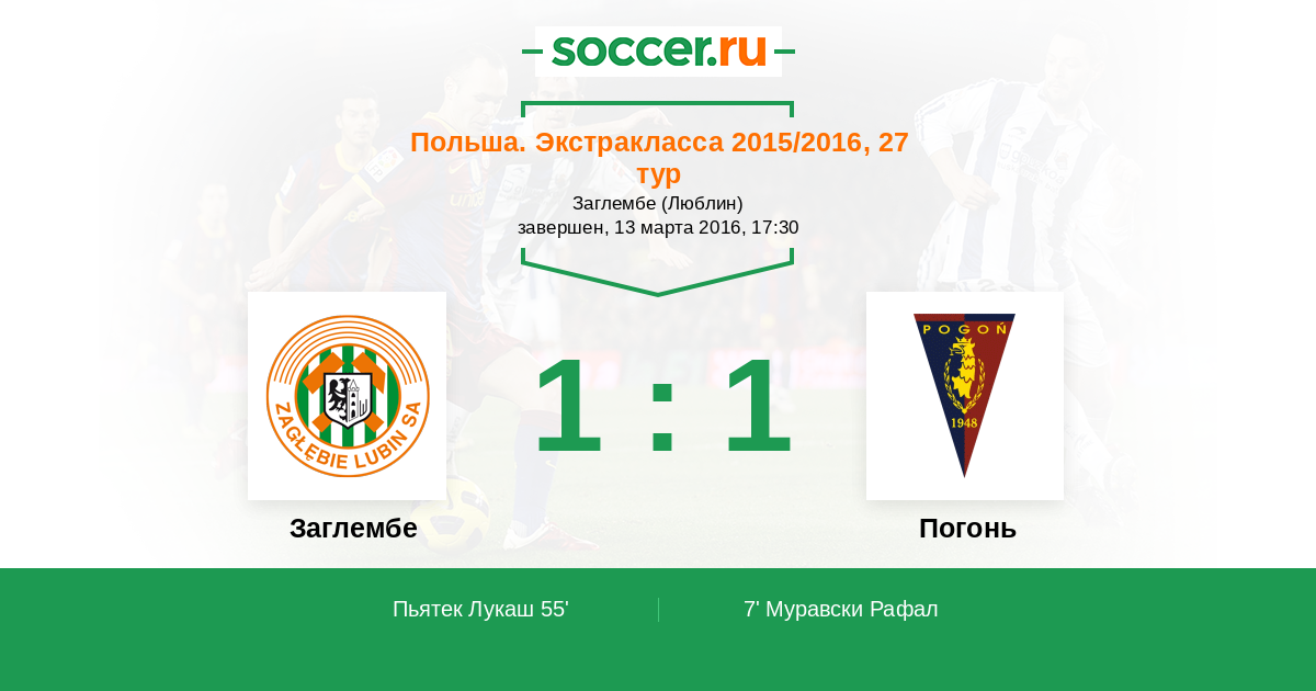 Польша. Экстракласса 08.05.2016 Погонь Логотип футбольный клуб Погонь (Щецин) 1:3 Логотип футбольный клуб Заглембе (Любина) Заглембе