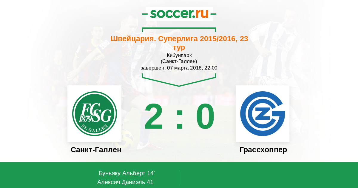 Швейцария. Суперлига 23.04.2016 Грассхоппер Логотип футбольный клуб Грассхоппер (Цюрих) 2:0 Логотип футбольный клуб Санкт-Галлен Санкт-Галлен
