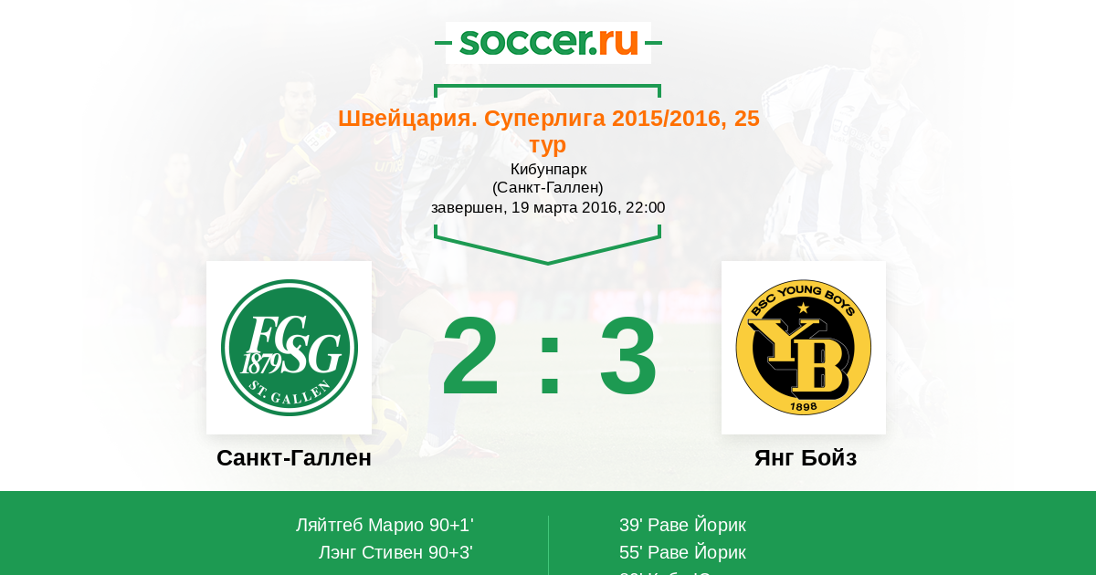 Швейцария. Суперлига 11.04.2015 Санкт-Галлен Логотип футбольный клуб Санкт-Галлен 3:1 Логотип футбольный клуб Янг Бойз (Берн) Янг Бойз