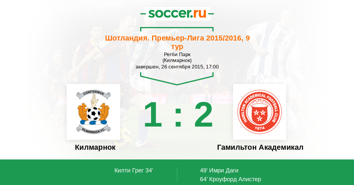 Шотландия. Премьер-Лига 02.05.2015 Килмарнок Логотип футбольный клуб Килмарнок 2:3 Логотип футбольный клуб Гамильтон Академикал Гамильтон Академикал