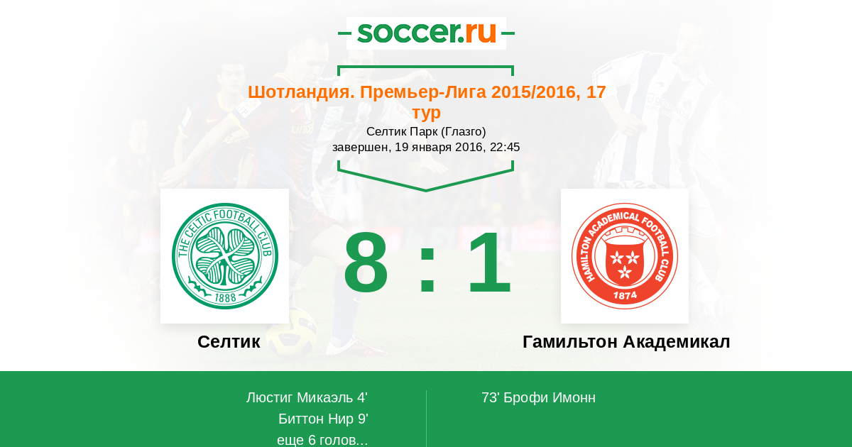Шотландия. Премьер-Лига 25.02.2017 Селтик Логотип футбольный клуб Селтик (Глазго) 2:0 Логотип футбольный клуб Гамильтон Академикал Гамильтон Академикал