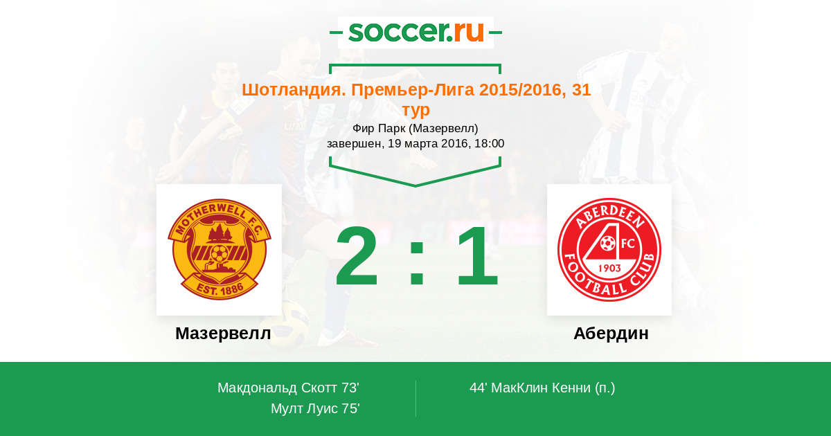 Шотландия. Премьер-Лига 02.04.2011 Мазервелл Логотип футбольный клуб Мазервелл 2:1 Логотип футбольный клуб Абердин Абердин