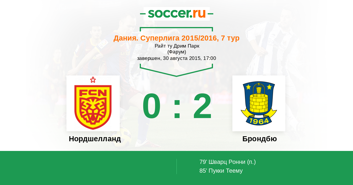 Дания. Суперлига 06.12.2015 Нордшелланд Логотип футбольный клуб Нордшелланд (Фарум) 0:2 Логотип футбольный клуб Брондбю (Брённбю) Брондбю