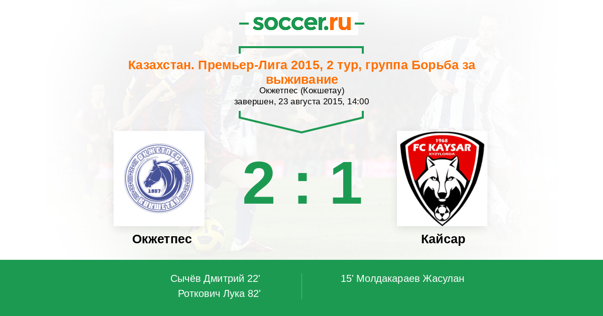 Казахстан. Премьер-лига 26.08.2012 Окжетпес Логотип футбольный клуб Окжетпес (Кокшетау) 2:2 Логотип футбольный клуб Кайсар (Кызылорда) Кайсар