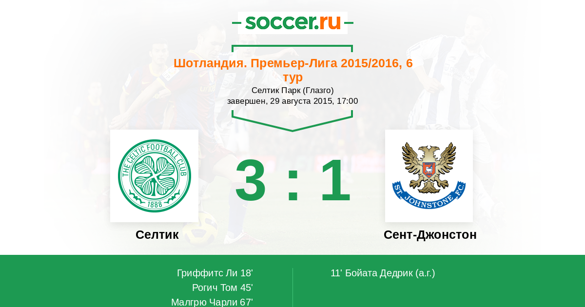 Шотландия. Премьер-Лига 13.12.2015 Сент-Джонстон Логотип футбольный клуб Сент-Джонстон (Перт) 0:3 Логотип футбольный клуб Селтик (Глазго) Селтик