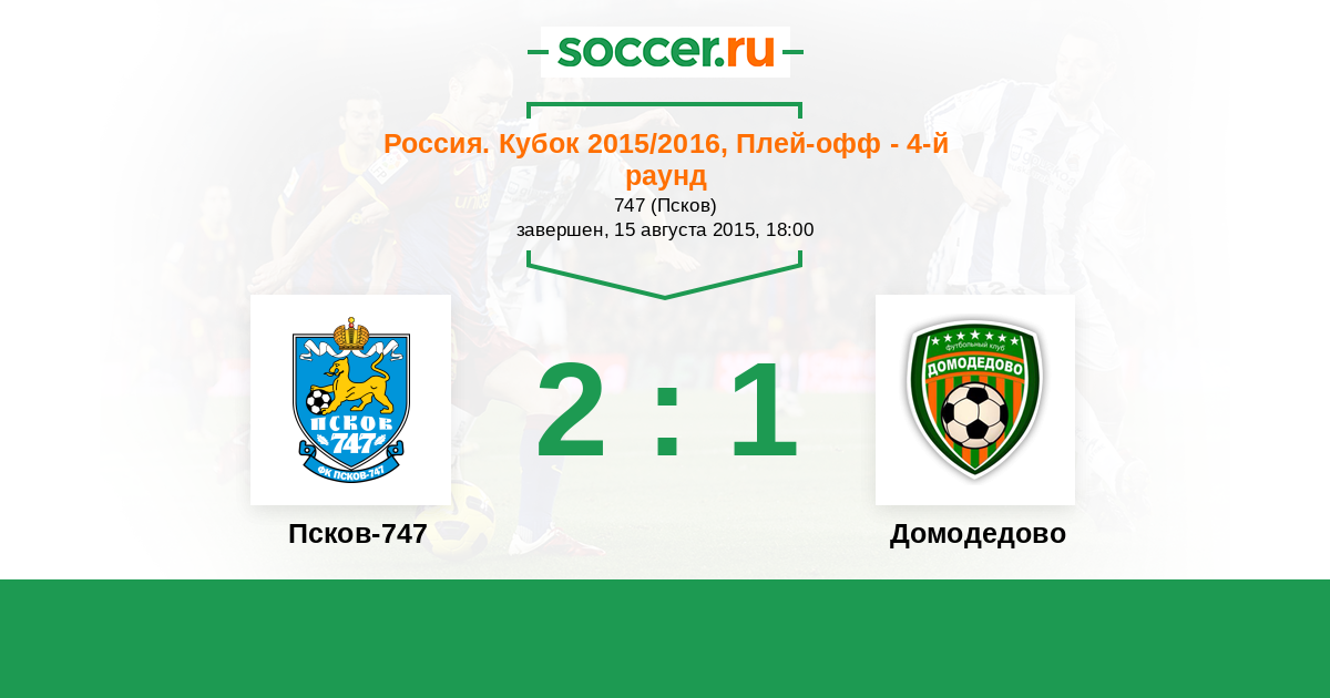 Россия. Вторая лига. Группа 2 18.08.2015 Псков-747 Логотип футбольный клуб Псков-747 1:0 Логотип футбольный клуб Домодедово (Москва) Домодедово