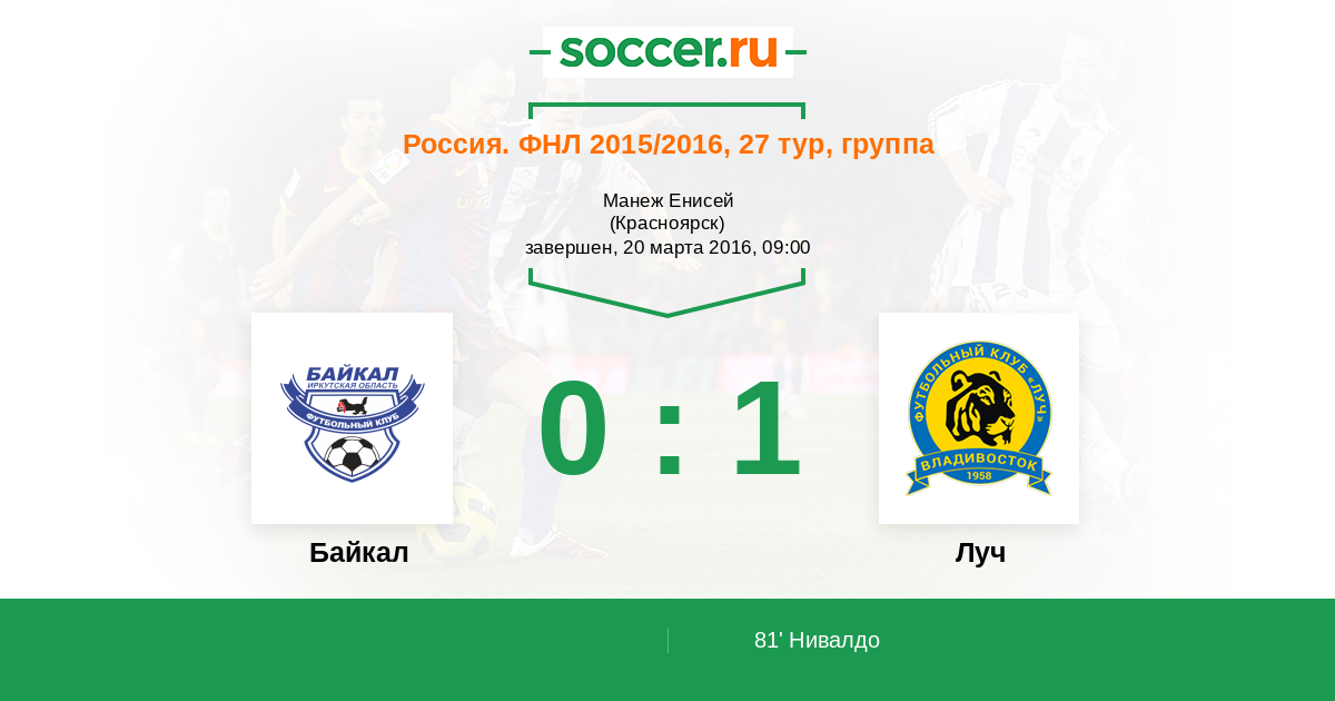 Россия. Первая лига 31.08.2015 Луч Логотип футбольный клуб Луч (Владивосток) 1:0 Логотип футбольный клуб Байкал (Иркутск) Байкал