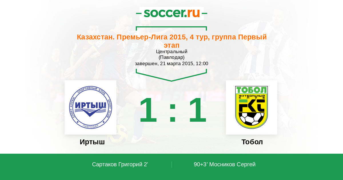 Казахстан. Премьер-лига 06.07.2014 Тобол Логотип футбольный клуб Тобол (Костанай) 1:1 Логотип футбольный клуб Иртыш (Павлодар) Иртыш