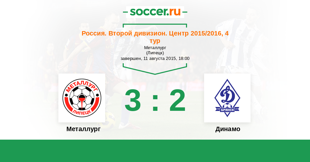 Россия. Вторая лига. Группа 3 06.05.2015 Металлург Логотип футбольный клуб Металлург (Липецк) 0:0 Логотип футбольный клуб Динамо Брянск Динамо Брянск