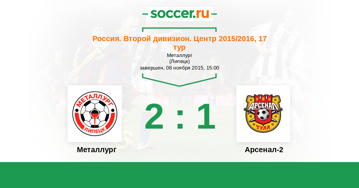 Россия. Вторая лига. Группа 3 29.10.2014 Арсенал-2 Логотип футбольный клуб Арсенал-2 (Тула) 1:5 Логотип футбольный клуб Металлург (Липецк) Металлург