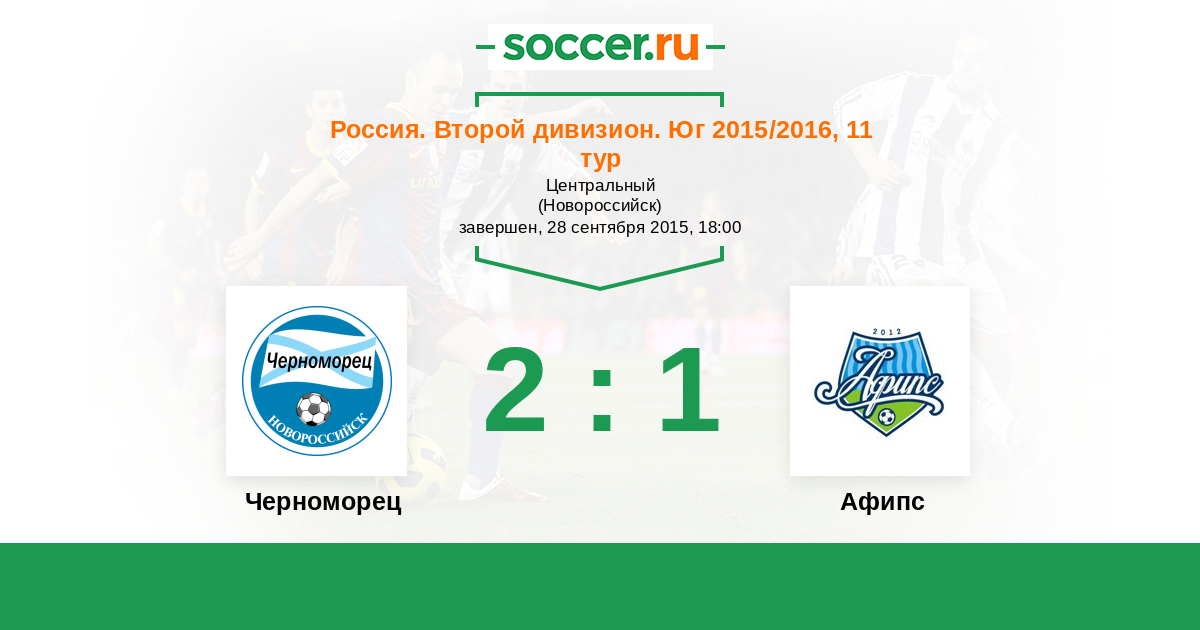 Россия. Вторая лига. Группа 1 09.09.2016 Афипс Логотип футбольный клуб Афипс (Афипский) 2:0 Логотип футбольный клуб Черноморец (Новороссийск) Черноморец