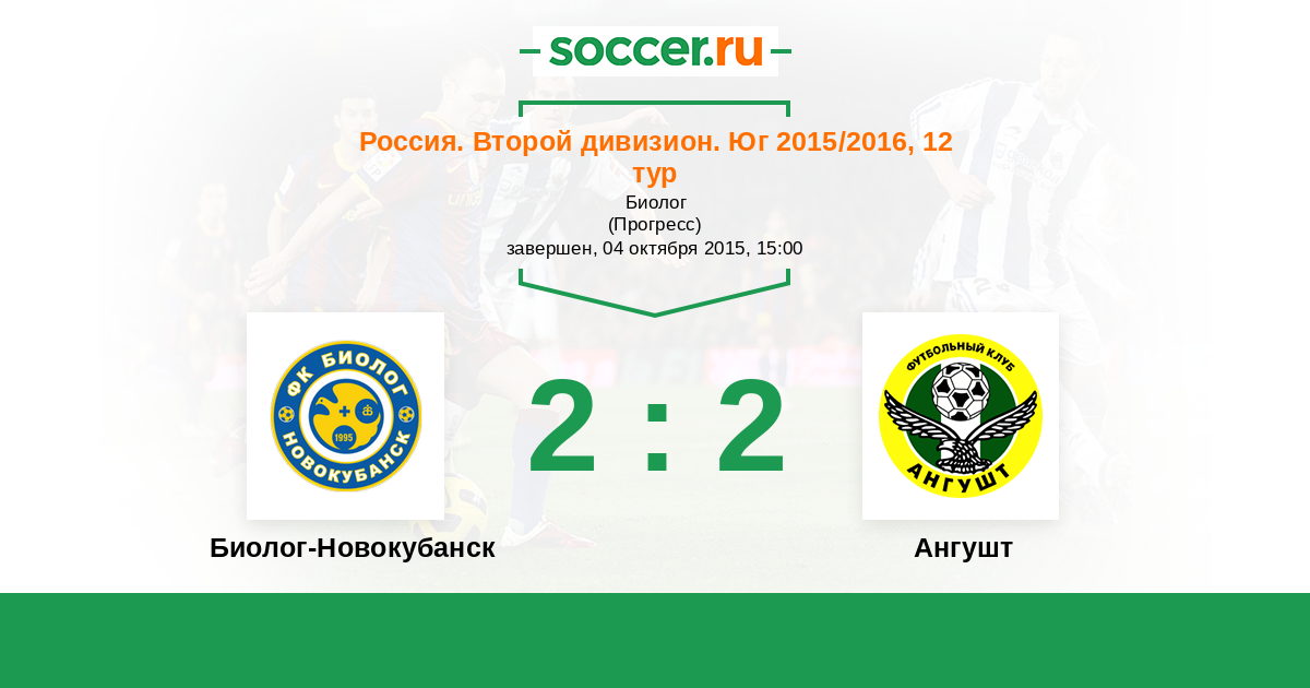 Россия. Вторая лига. Группа 1 04.05.2015 Биолог-Новокубанск Логотип футбольный клуб Биолог-Новокубанск 2:1 Логотип футбольный клуб Ангушт (Назрань) Ангушт