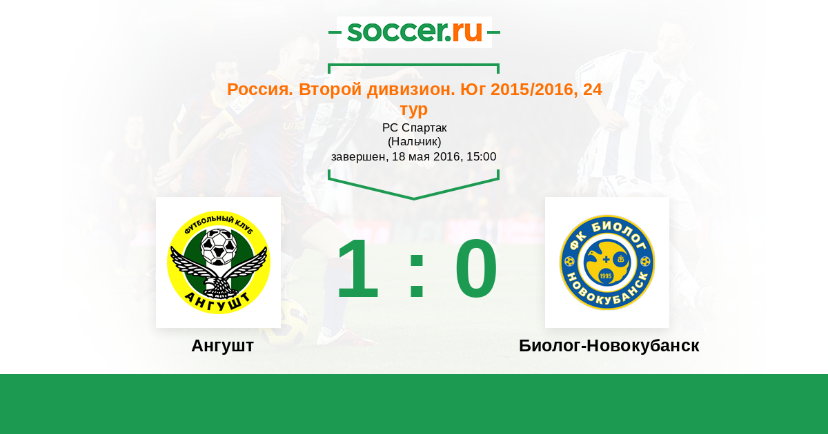 Россия. Вторая лига. Группа 1 04.05.2015 Биолог-Новокубанск Логотип футбольный клуб Биолог-Новокубанск 2:1 Логотип футбольный клуб Ангушт (Назрань) Ангушт