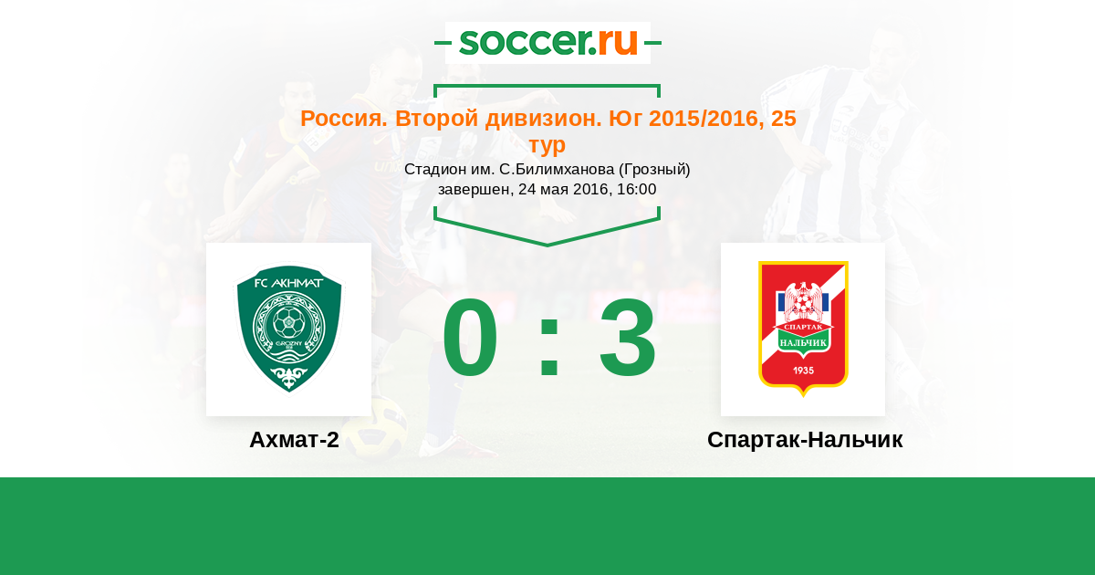 Россия. Вторая лига. Группа 1 24.05.2016 Ахмат-2 Логотип футбольный клуб Ахмат-2 (Грозный) 0:3 Логотип футбольный клуб Спартак-Нальчик Спартак-Нальчик