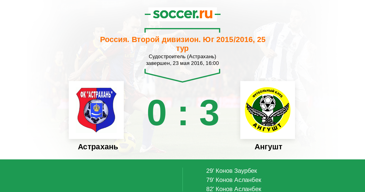 Россия. Вторая лига. Группа 1 11.10.2015 Ангушт Логотип футбольный клуб Ангушт (Назрань) 1:1 Логотип футбольный клуб Астрахань Астрахань