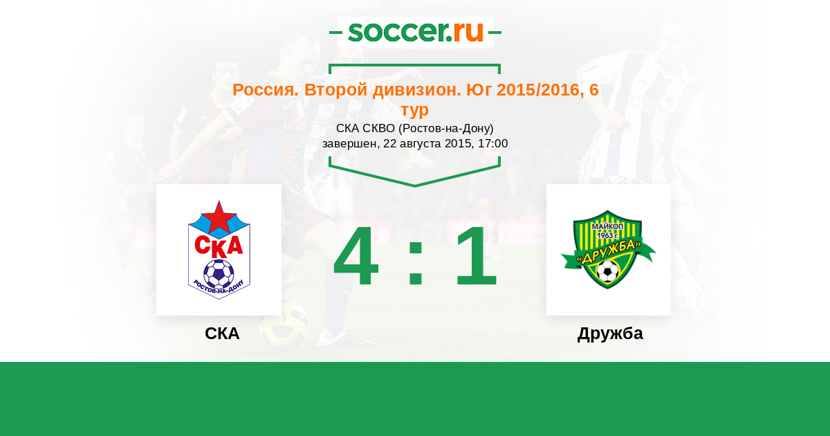 Россия. Вторая лига. Группа 1 02.10.2016 СКА Логотип футбольный клуб СКА (Ростов-на-Дону) 1:0 Логотип футбольный клуб Дружба (Майкоп) Дружба