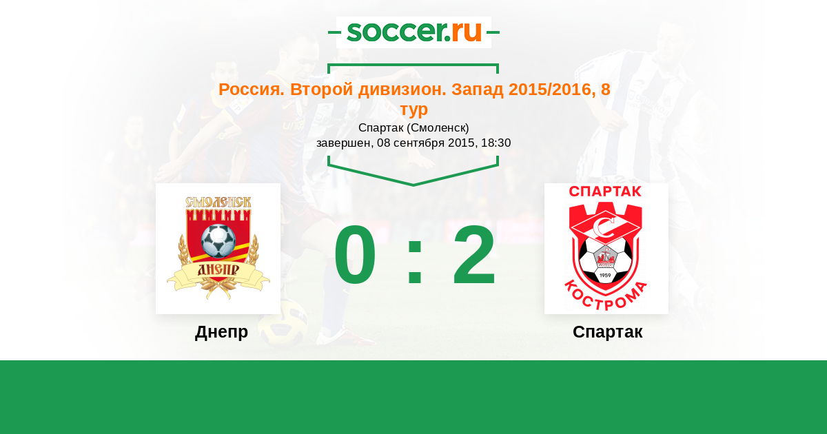 Россия. Вторая лига. Группа 2 05.10.2014 Днепр Логотип футбольный клуб Днепр (Смоленск) 0:2 Логотип футбольный клуб Спартак Кострома Спартак Кострома