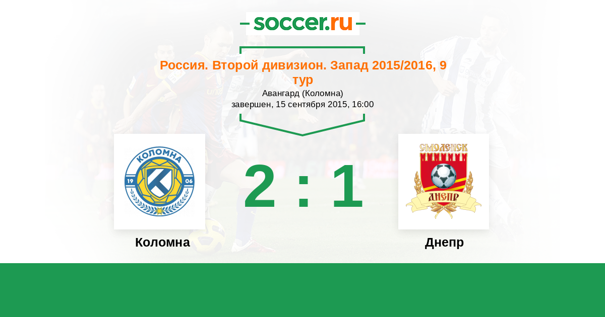 Россия. Вторая лига. Группа 2 24.04.2016 Днепр Логотип футбольный клуб Днепр (Смоленск) 1:0 Логотип футбольный клуб Коломна Коломна