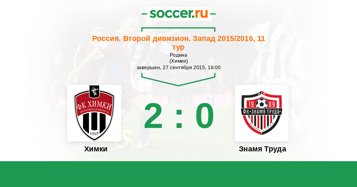 Россия. Вторая лига. Группа 2 17.09.2014 Знамя Труда Логотип футбольный клуб Знамя Труда (Орехово-Зуево) 1:1 Логотип футбольный клуб Химки Химки