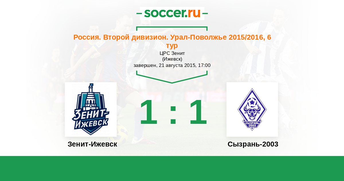 Россия. Вторая лига. Группа 4 05.06.2015 Зенит-Ижевск Логотип футбольный клуб Зенит-Ижевск 1:1 Логотип футбольный клуб Сызрань-2003 Сызрань-2003
