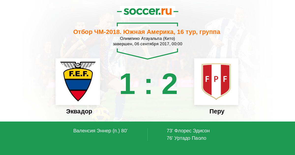 Отбор ЧМ. Южная Америка 07.09.2016 Перу Логотип Перу 2:1 Логотип Эквадор Эквадор