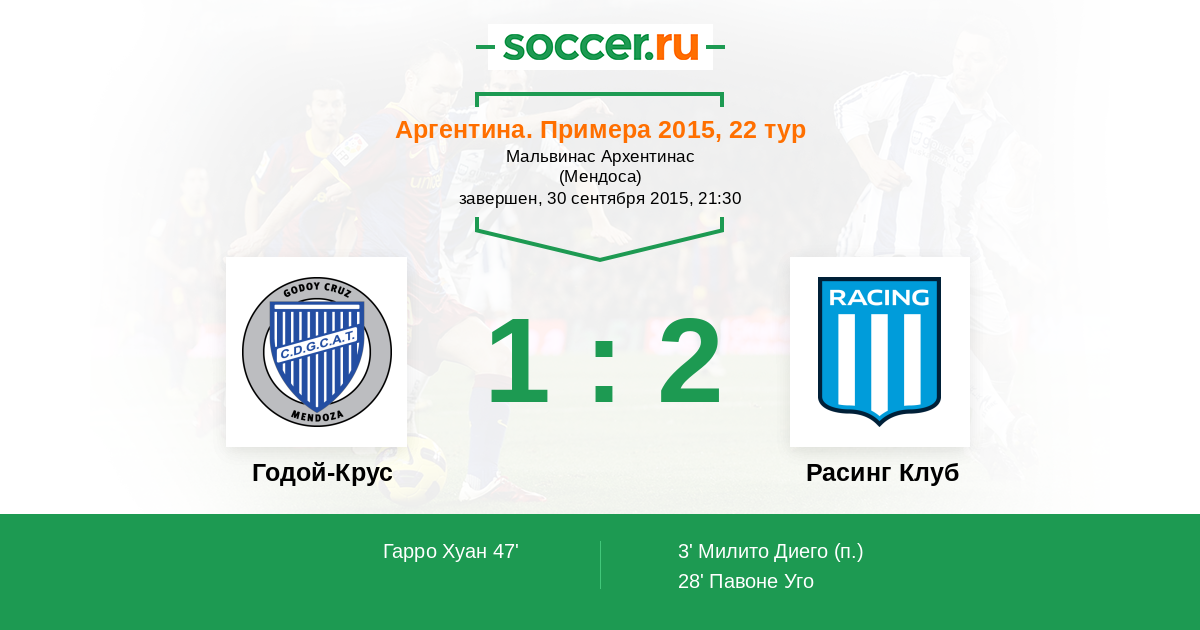Аргентина. Суперлига 26.03.2017 Расинг Клуб Логотип футбольный клуб Расинг Клуб (Авельянеда) 2:1 Логотип футбольный клуб Годой-Крус Годой-Крус
