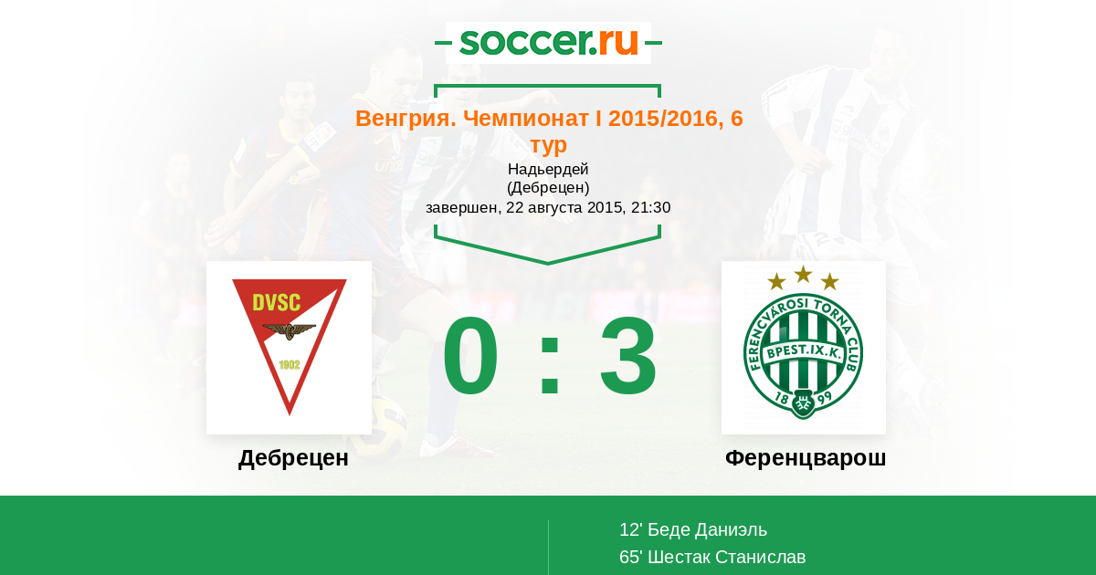 Венгрия. Чемпионат 1 02.04.2016 Дебрецен Логотип футбольный клуб Дебрецен 2:1 Логотип футбольный клуб Ференцварош (Будапешт) Ференцварош