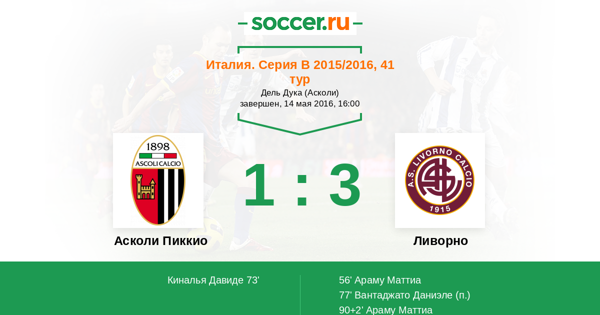 Италия. Серия В 23.12.2015 Ливорно Логотип футбольный клуб Ливорно 1:3 Логотип футбольный клуб Асколи Пиккио (Асколи-Пичено) Асколи Пиккио