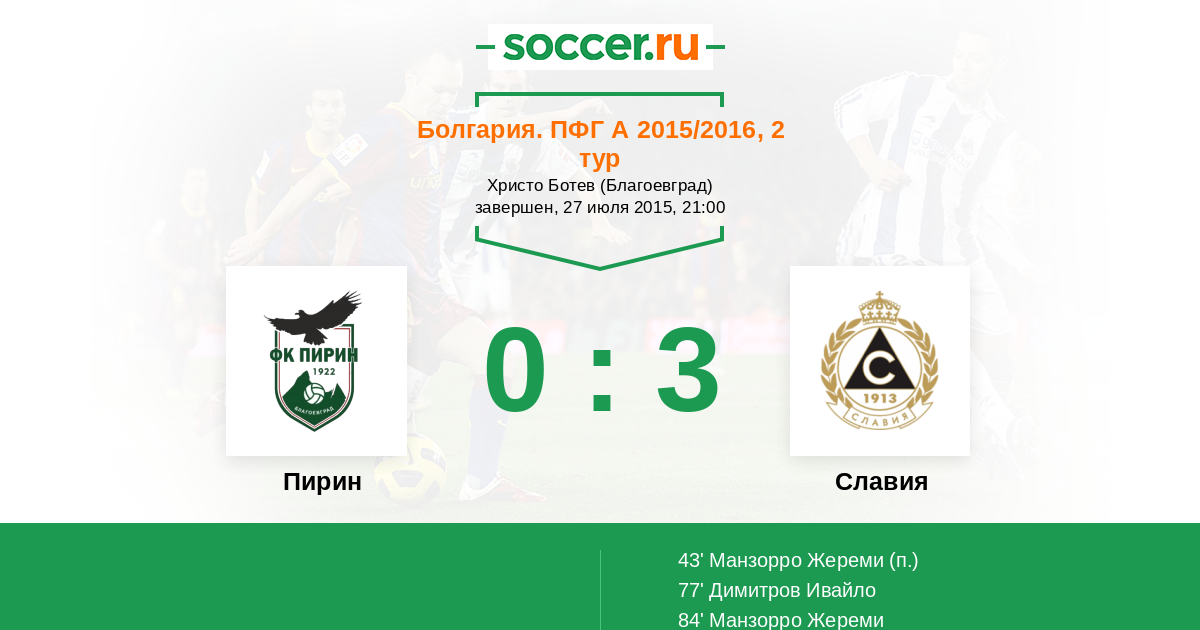 Болгария. Первая лига 03.10.2015 Славия Логотип футбольный клуб Славия (София) 0:0 Логотип футбольный клуб Пирин (Благоевград) Пирин
