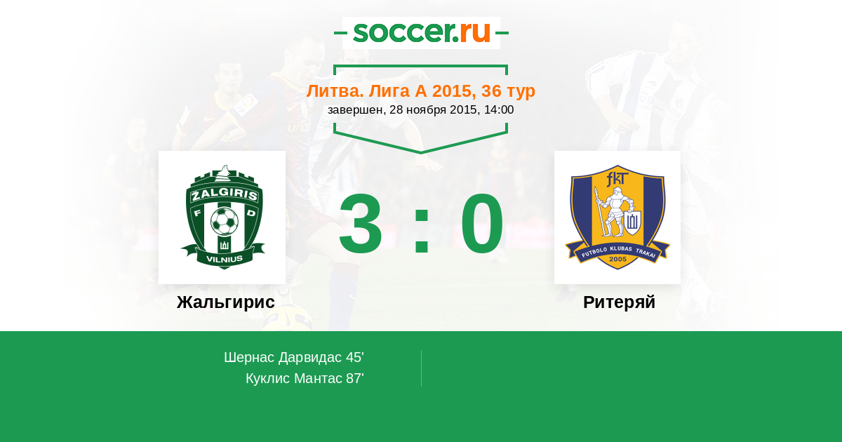 Литва. Лига А 05.10.2014 Жальгирис Логотип футбольный клуб Жальгирис (Вильнюс) 3:0 Логотип футбольный клуб Тракай Тракай