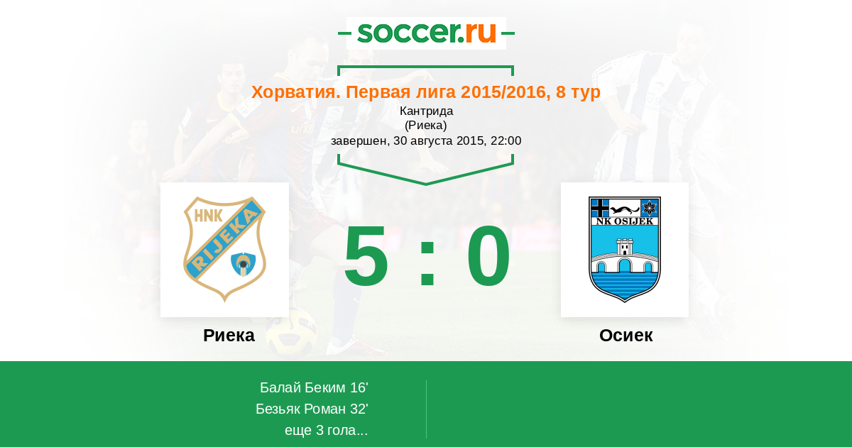 Хорватия. Первая лига 06.03.2016 Риека Логотип футбольный клуб Риека 2:1 Логотип футбольный клуб Осиек Осиек
