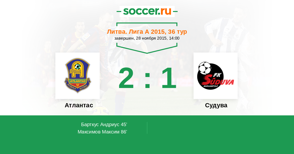 Литва. Лига А 17.04.2015 Судува Логотип футбольный клуб Судува (Мариямполе) 1:1 Логотип футбольный клуб Атлантас (Клайпеда) Атлантас