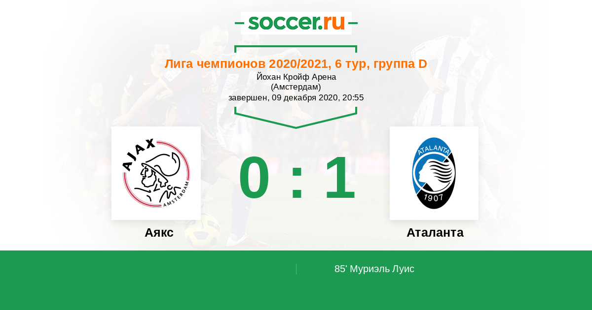 Не смотря на, мягко говоря, спорное удаление игрока Аякса (Гравенберг вроде спиной повернут к Гомесу и не мог его видеть), не могу отделаться от мысли, что Аякс всё таки не наиграл в этом матче на победу... Да, мяч контролировали, но что с ним делать как будто не придумали... Неоткуда взять победный гол, если наносишь 2 удара в створ, и почти не создаешь моментов против такой дисциплинированной команды как Аталанта... Ну а у бергамасков удачно вышел на замену Муриэль.