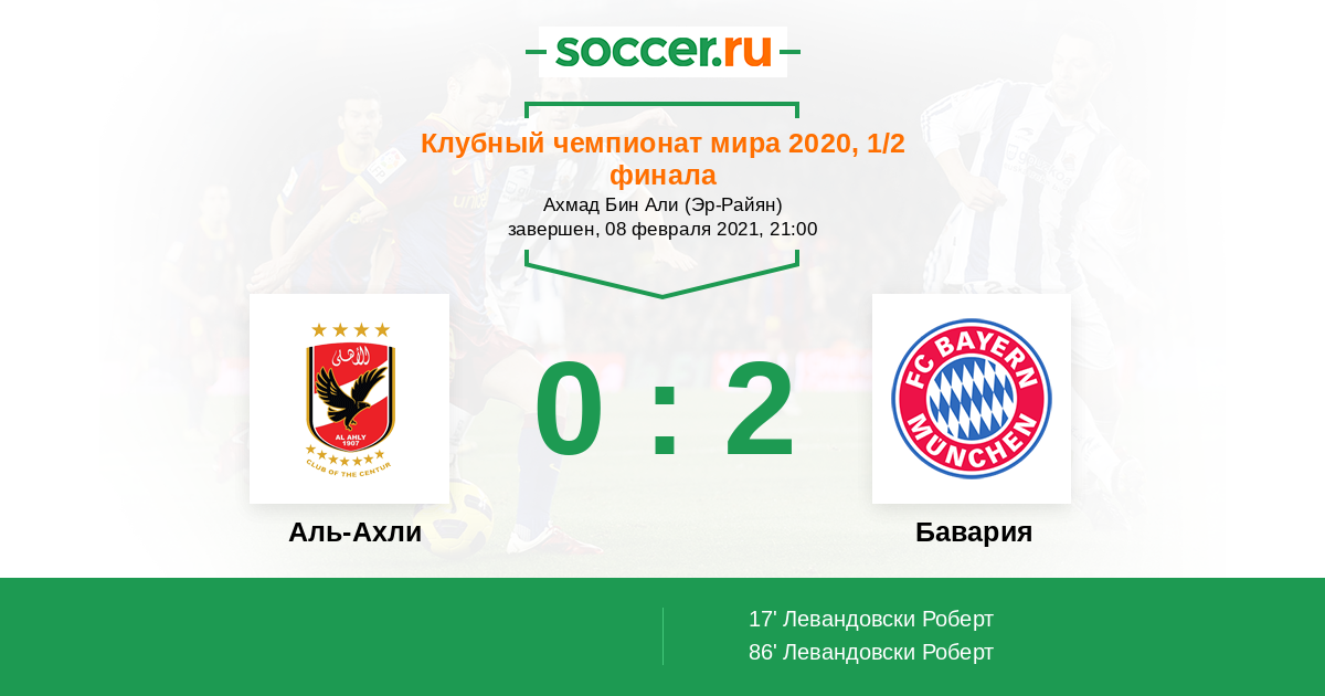 Сегодняшний полуфинальный матч между Аль - Ахли и Баварией должен быть интересным в том плане, что для гостей это не будет легкой прогулкой.  В Египте каждый футболист вдохновлён игрой Салаха на европейской арене и все мечтают повторить путь Салаха к сердцам болельщиков. Девятикратный победитель африканской Лиги Чемпионов сегодня даст бой команде Баварии выигрывавшей шесть раз Кубок Европейских Чемпионов и Лигу Чемпионов УЕФА, Межконтинентальный Кубок 2 раз 1976 и 2001, и Обладателем Клубного Кубка Мира ФИФА 2013 году с Хосепом Гвардиолой. В этом матче лучше поставить на тотал больше и наслаждаться игрой соперников. Удачи