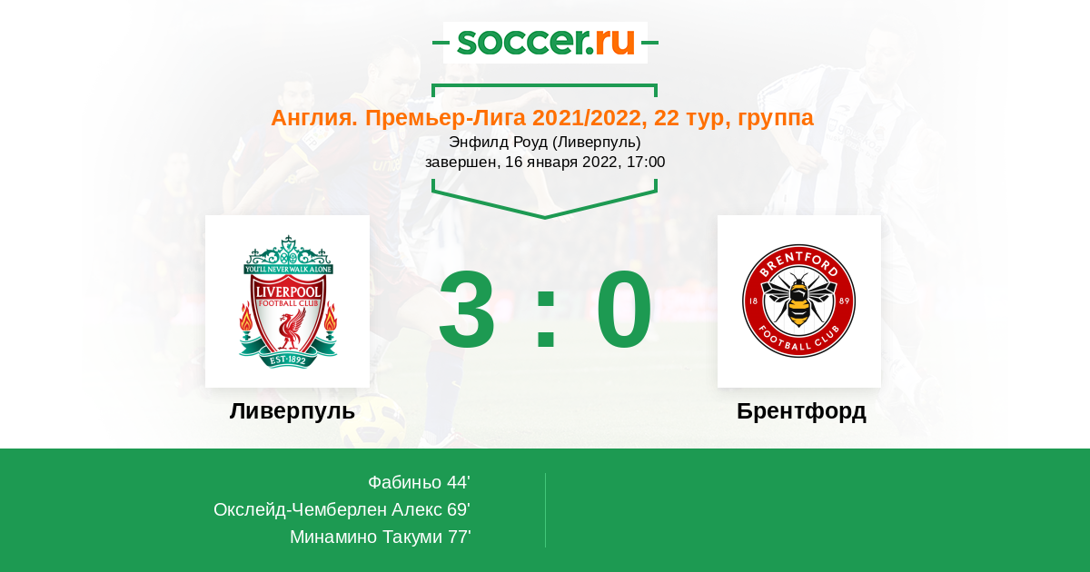 В первом круге команды завершили встречу результативной ничьей 3:3. Последние матчи намекают на то, что насыщенный голами сценарий может повториться. До нулевой ничьи с "Арсеналом" в трех подряд домашних матчах "Ливерпуля" было забито минимум четыре гола. А в каждом из десяти последних выездных матчей "Брентфорда" было забито минимум два гола.
