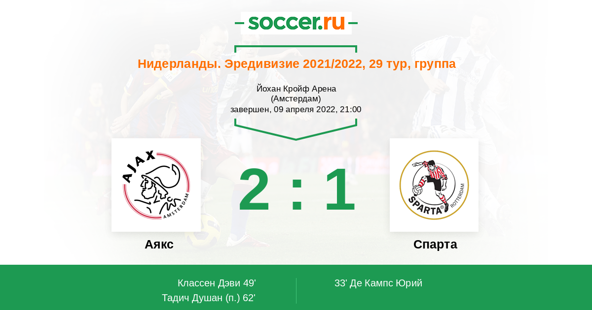 В этом матче между командами "Аякса" и "Спарта" явным фаворитом является команда хозяев поля, которые уверенно лидирует в чемпионате. А вот гости ведут борьбу в нижней части турнирной таблицы. Поэтому прогноз победа хозяев и тотал больше в 1-м тайме -1,5. Удачи