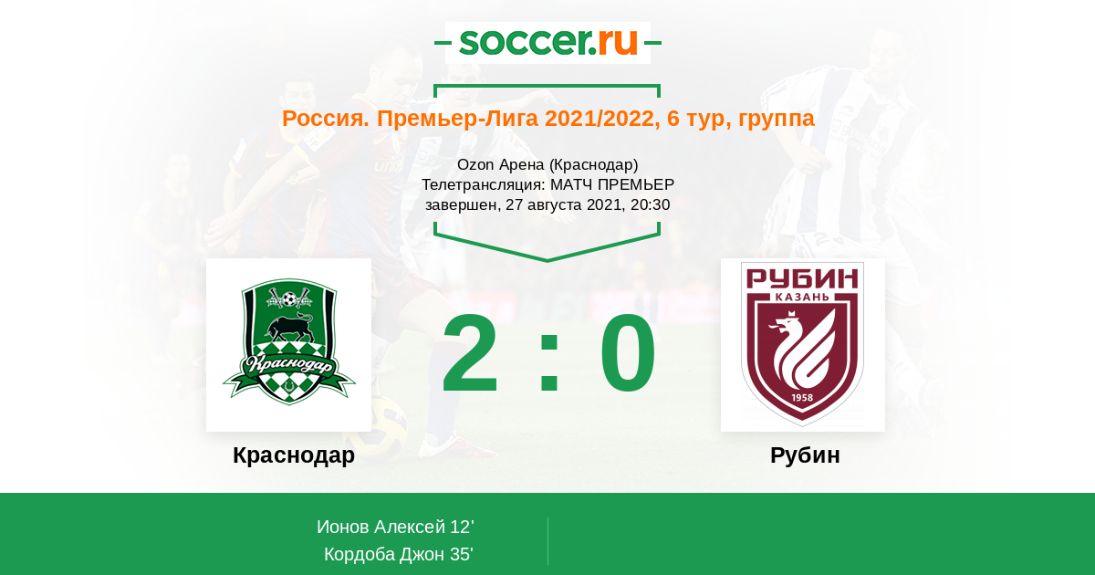 Ну а Рубин и по качеству и классу игроков уступает нынешнему Краснодару , что и отразилось на самой игре и итоговому счёту на табло . Поздравляю Быков с заслуженной Победой, а Рубину Удачи в следующих играх !!! Всем Добра !!!
