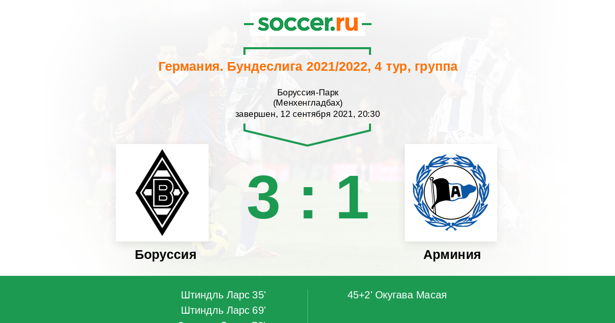 В прошлом сезоне 5-0 Гладбах соперника разбил, да и состав с тех пор кардинально у Боруссии не менялся. То что Арминия пока без поражений по сезону связываю с исключительно игрой на своем поле, где они спались от Айнтрахта и нули удержали с прагматичным Фрайбургом, тогда как Гройтер Фюрт многими специалистами называется основным претендентом на вылет из Бундеслиги, и 1-1 с ним на выезде не достижение особо.