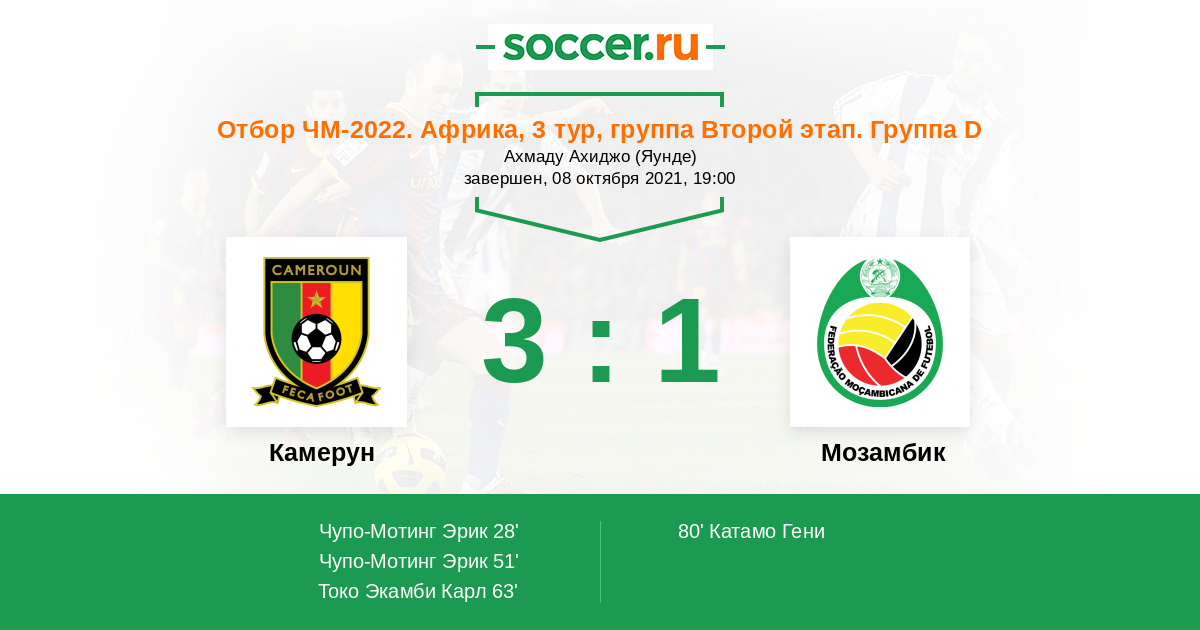 Главным соперником сборной Камеруна является сборная Кот-д'Ивуара, которая уже успела нанести им одно поражение. Больше права на ошибку нет и победа над Мозамбиком должна быть добыта кровь из носу. Но разгрома не будет...
