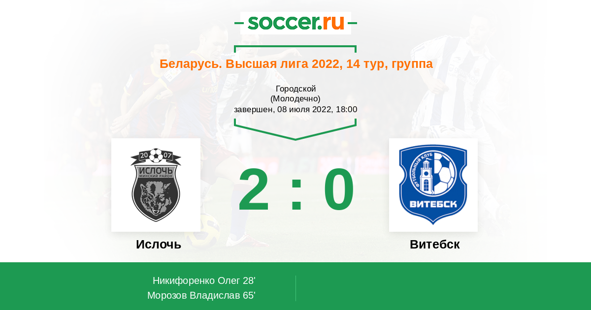 В этом матче в рамках высшего дивизиона чемпионата Беларуси по футболу сыграют Ислочь и Витебск. На сегодняшний день хозяева набрали 22 очка и занимает 4 место в турнирной таблице отставая от лидера на 6 очков. Гости с 10 набранными очками расположились на 13 месте. Несмотря на то, что они являются аутсайдерами, в обороне они играть умеют. В трех последних матчах они дважды пропустили по одному голу и один раз сыграли на ноль. Так что хозяевам нужно приложить максимум усилий, чтобы одержать победу.