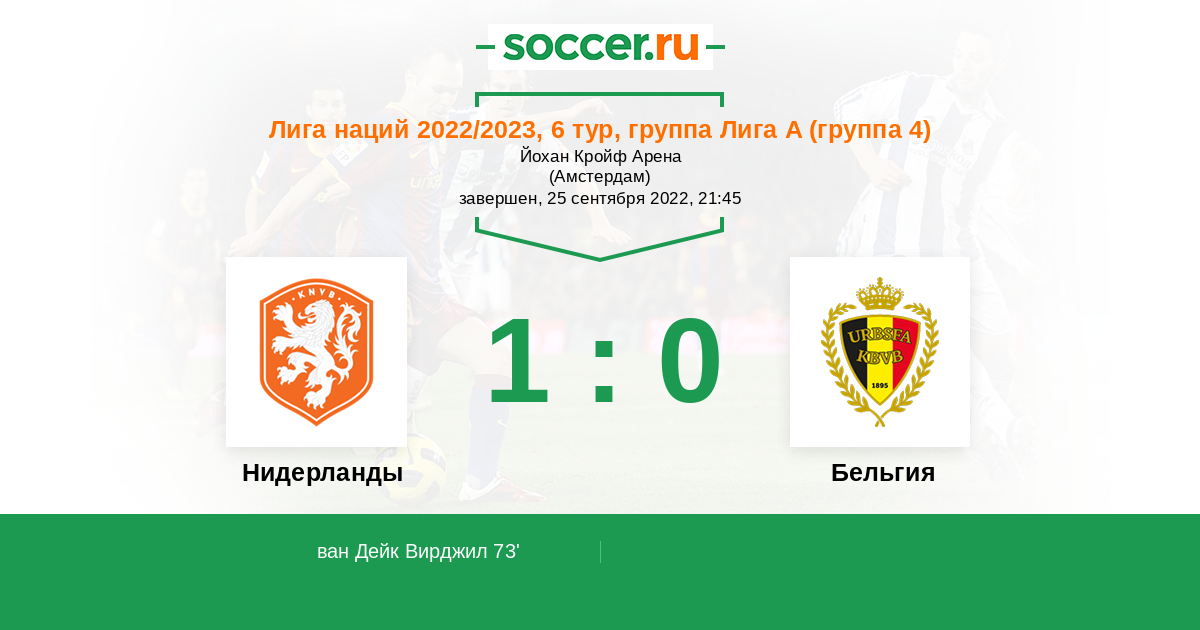 Сборной Нидерландов осталось сделать последний шаг, чтобы попасть в топ-4 Лиги А Лиги наций УЕФА. Для этого достаточно не проиграть крупно соседям из сборной Бельгии, но "оранжевые" дома играют очень хорошо: постоянно забивают и не проигрывают более двух лет, так что даже про игру на ничью речь может идти только шепотом. С другой стороны, Луи ван Гала порадовала последняя встреча с Польшей (2:0), в которой удалось впервые за долгое время сыграть на ноль, что очень полезно перед предстоящим через несколько месяцев стартом чемпионата мира. Не исключено, что игра с Бельгией будет отдана для закрепления надежности в обороне. Сборная Бельгии ни разу не побеждала Нидерланды в гостях и на сегодняшний момент сделать это будет очень трудно. У "оранжевых" больший запас для усиления игры перед своими болельщиками, даже если что-то будет идти не так по ходу матча. Но все же стоит рассмотреть равную игру, которая не определит победителя. Во чтобы-то ни стало, алтарь на победу положен не будет, несмотря на принципиальность.