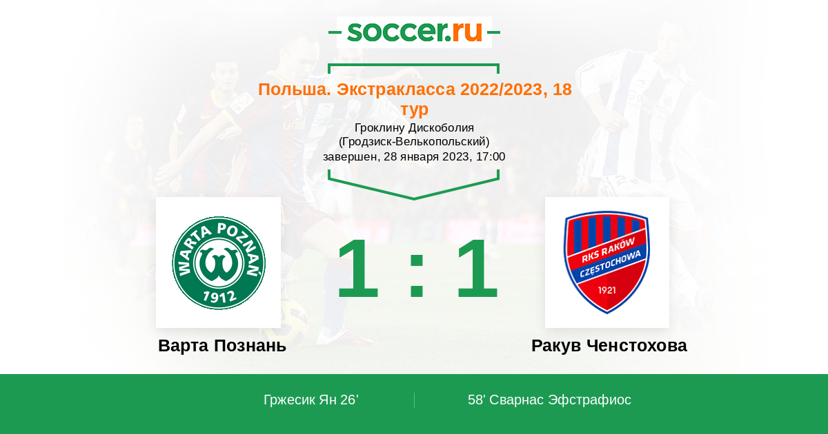 Ракув не разу не проигрывал Варте. Команда борется за чемпионство и занимает промежуточное третье место. Два выигрыша хозяев, конечно настораживают, но, думаю гости обезопасят себя от случайностей и забьют два гола минимум.