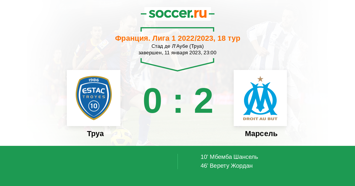 Приветствую всех любителей футбола! Считаю тут нас ждёт очень напряжённый и интересный матч от обеих команд! Труа против Марселя в рамках Лиги 1! Труа на своём стадионе очень неудобный соперник для Марселя как мы видем это в последнем их противостоянии. Но всё таки Марселю очень нужны эти 3 очки и я думаю они смогут получить их