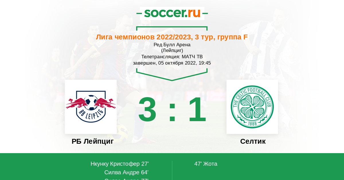 3 - го тура группового этапа Лиги Чемпионов УЕФА 22 23 между командами Ред Булл Лейпциг и Селтик Глазго , фаворитом на победу является команда хозяев Ред Булл Лейпциг.