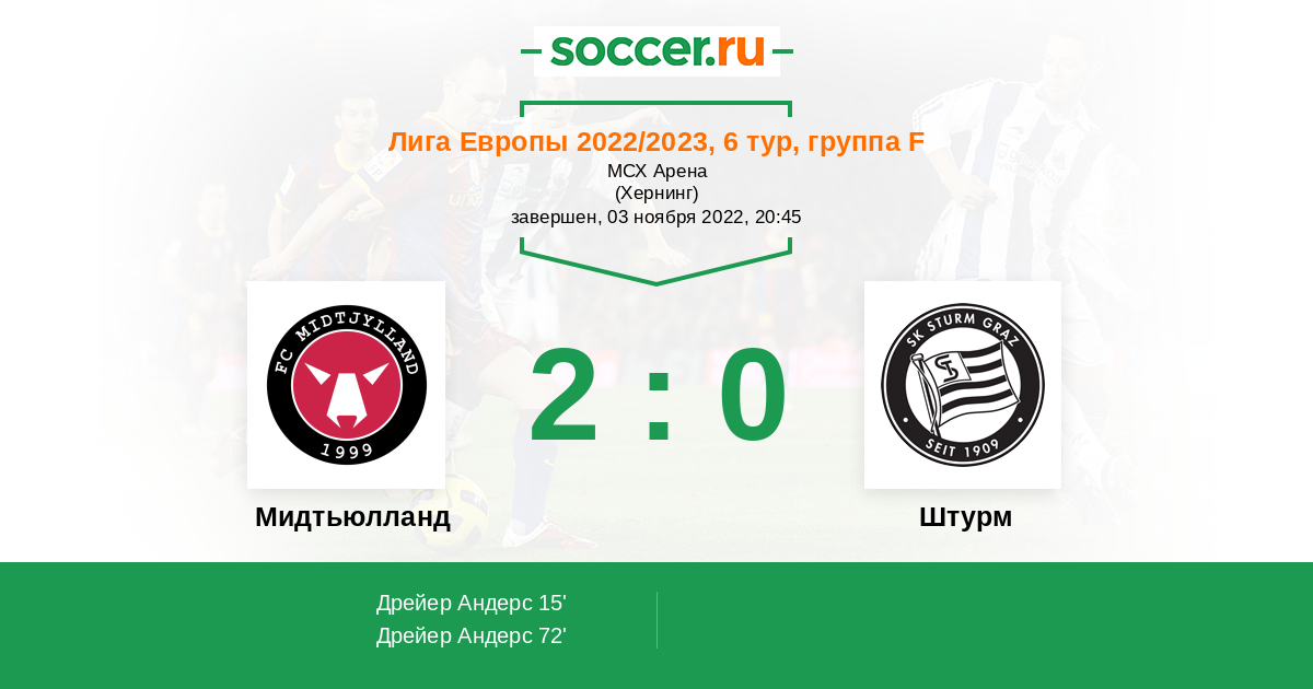 Я думаю что в этом противостоянии более чем явного фаворита на победу нет . Хотя и букмекеры отдают своё предпочтение команде хозяев поля Мидтьюлланд , но и команда гостей Штурм не является мальчиками для битья . Вполне возможно ожидается ничейный результат .