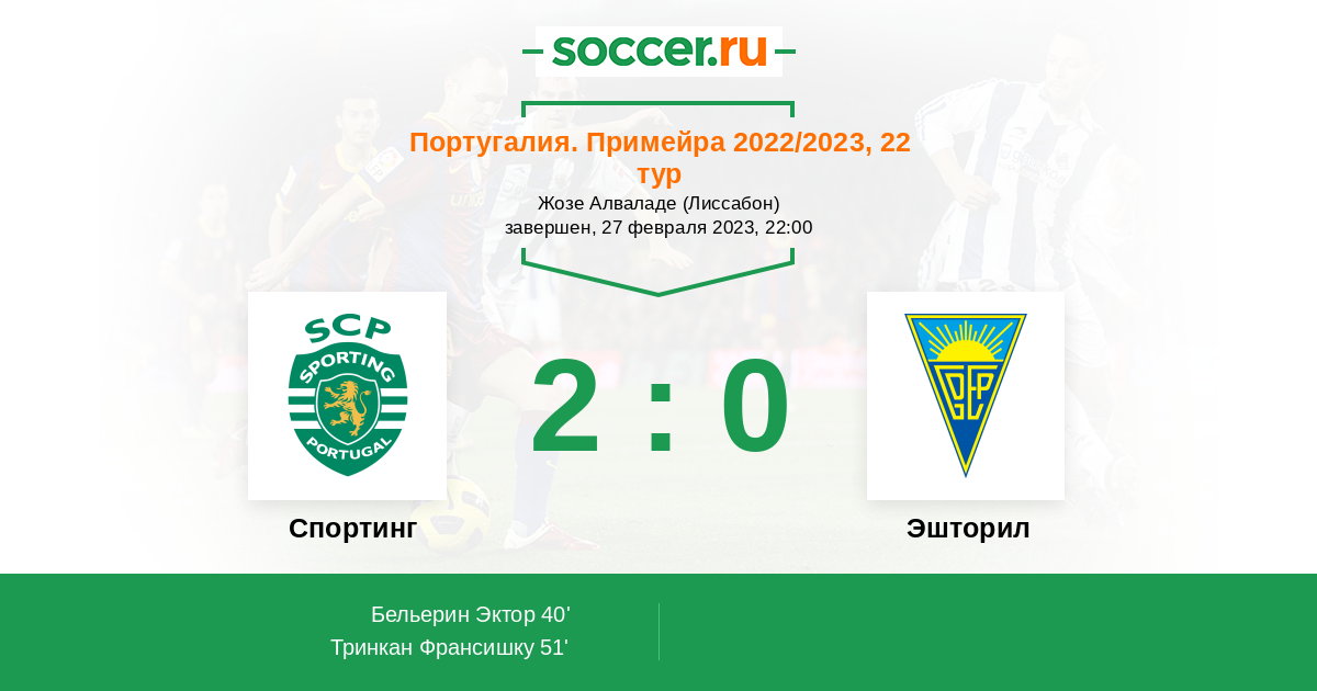 "Спортинг" подходит к матчу в очень хорошем настроении: команде удалось с лихвой реабилитироваться за нелепую домашнюю ничью с датским "Мидтьюлланном" и разгромить соперника в гостях. "Спортинг" играл настолько уверенно, что по сути задавил датчан этой уверенностью, спровоцировав того на глупые ошибки. Лиссабонцы не отличаются стабильностью в этом сезоне, но сейчас, кажется, команда попала в волну и готова продолжать штамповать победные результаты. "Эшторил" – очень удобный и приятный соперник. Эта команда проиграла в пяти последних гостевых матчах и вообще не впечатляет в целом. У нее лишь две победы в 17 предыдущих встречах, и обе дома над скромными соперниками. Сложно найти хотя бы какие-нибудь шансы у "Эшторила" в этом противостоянии. Ставим на уверенную победу "Спортинга", но держим в уме его усталость после Лиги Европы.