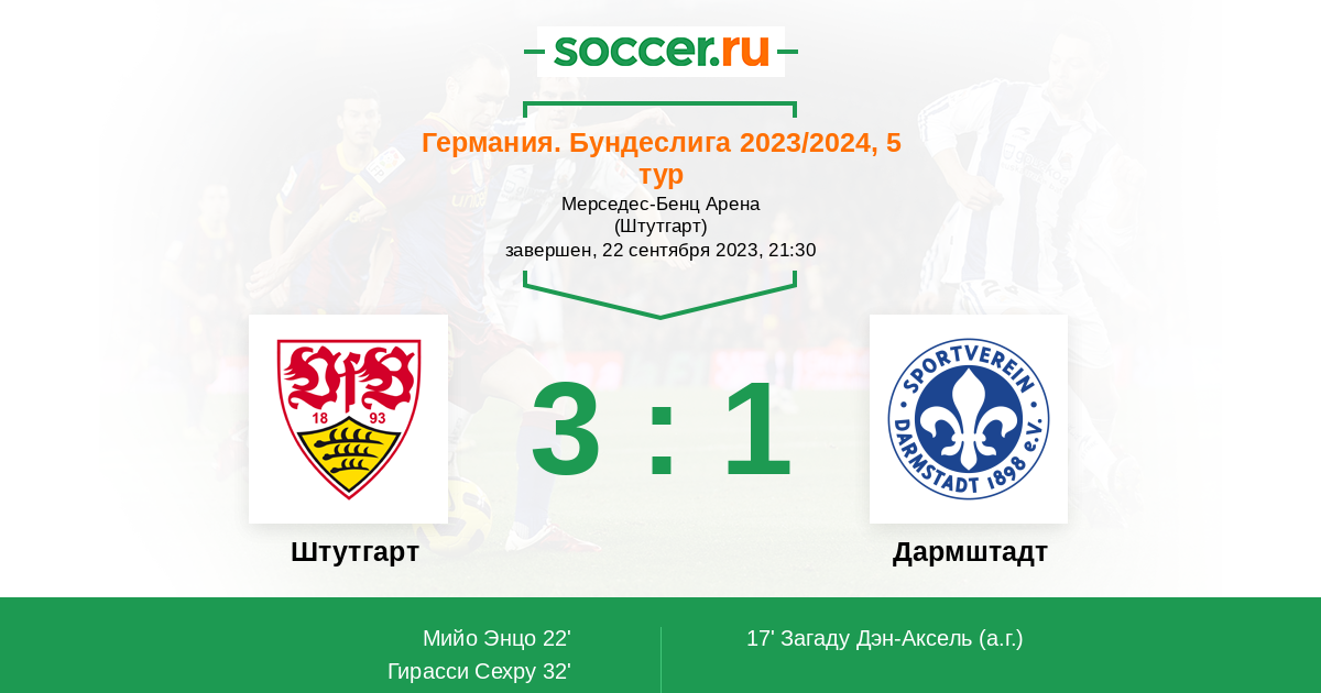 Гости только поднялись в элиту немецкого футбола из Второй Бундеслиге, но пока совершенно не готовы к такому уровню. “Дармштадт“ ужасно стартовал в кампании – сразу вылетел из Кубка и набрал только один балл за четыре тура чемпионата. “Дармштадт“ проиграл все три своих выезда в сезоне с общим счетом 1:9. У “Штутгарта“ четыре победы в пяти официальных матчах сезона. Все это говорит о высокой вероятности успеха хозяев.